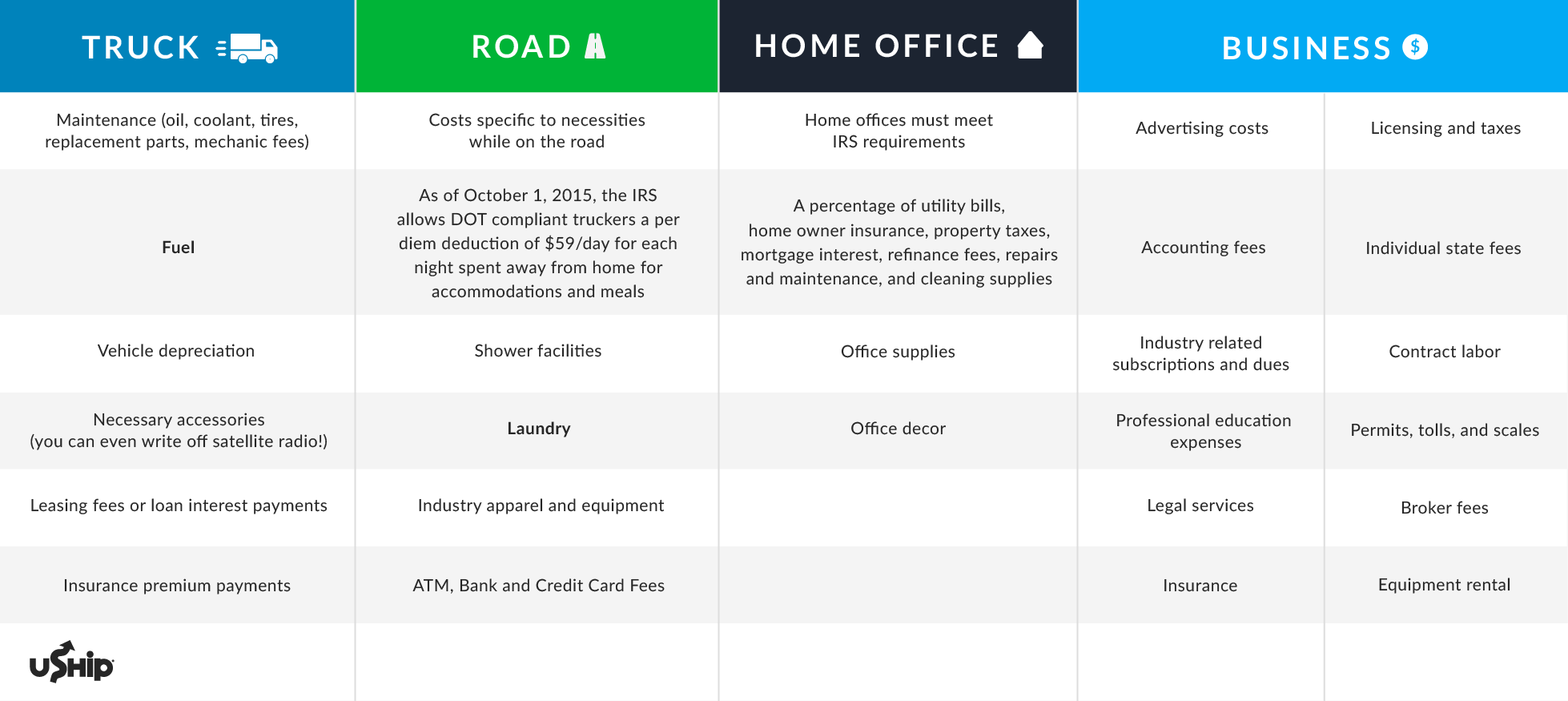 Tax Tips for Owner-Operators https://ushipblogsubd.wpengine.com/tips/tax-tips-for-owner-operators/ https://ushipblogsubd.wpengine.com/tips/tax-tips-for-owner-operators/#respond Wed, 06 Apr 2016 20:07:46 +0000 https://ushipblogsubd.wpengine.com/?p=4315 While we’re no tax experts, we’ve put together these tax tips as a helpful resource based on frequently asked questions we get around tax season. Click here for a high res version of the above chart. What tax forms does uShip provide? Short answer: None. Long answer: Service providers who utilize our online marketplace to... Read More