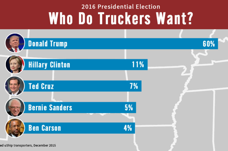 Among female truckers, which represented 11% of those polled, 45% prefer Trump, 18% for Clinton and 14% for Sanders. Among male truckers, 66% prefer Trump, 10% Clinton and 7% Cruz